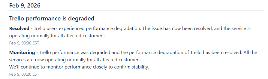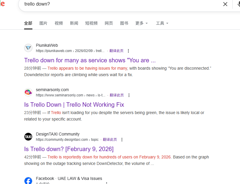 也有相关内容: https://community.designtaxi.com/topic/23282-is-trello-down-february-9-2026/ https://piunikaweb.com/2026/02/09/trello-down-not-working/ https://www.seminarsonly.com/news/is-trello-down-trello-not-working-fix/