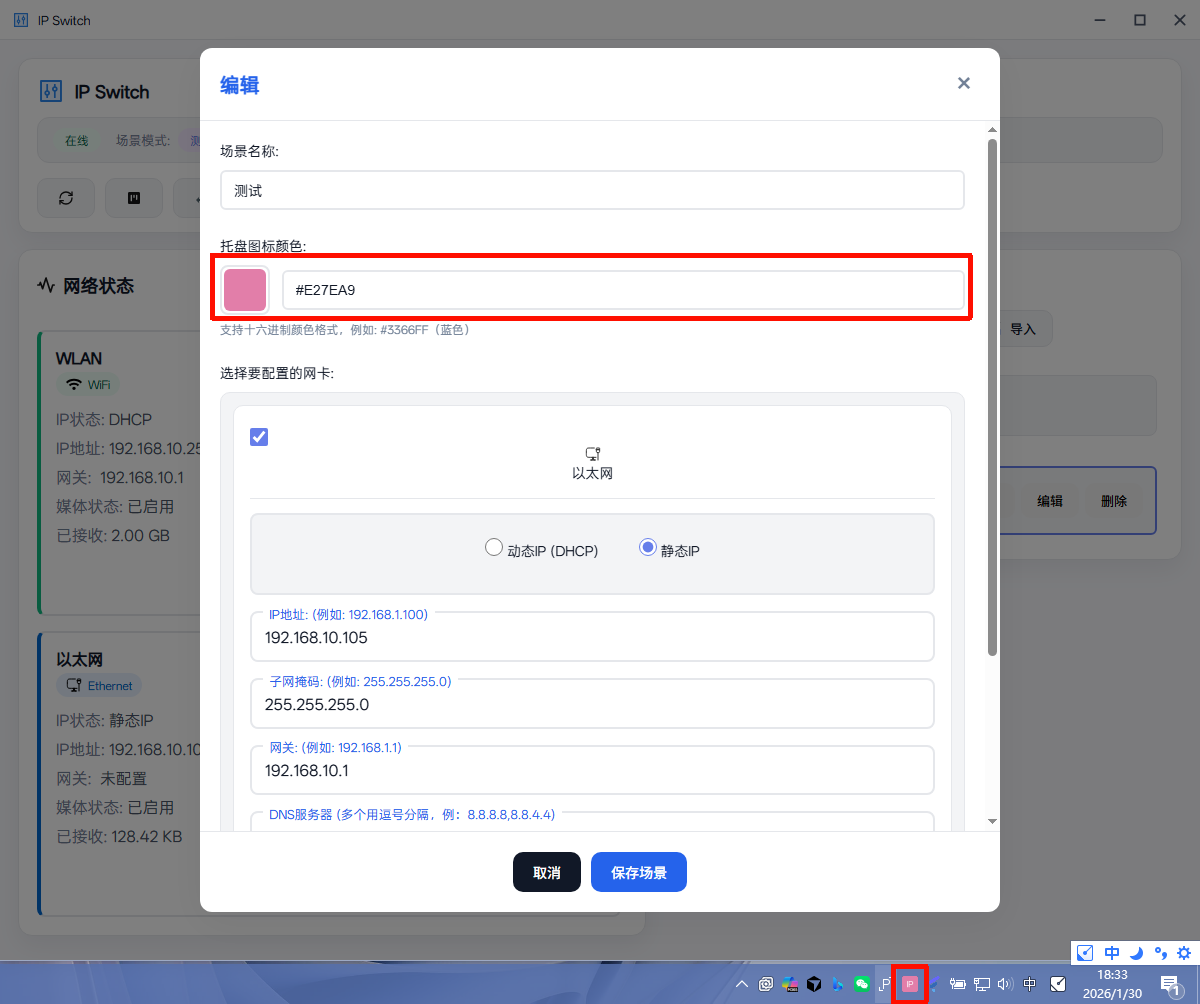 • 托盘图标颜色可自定义,根据网络状态动态变化